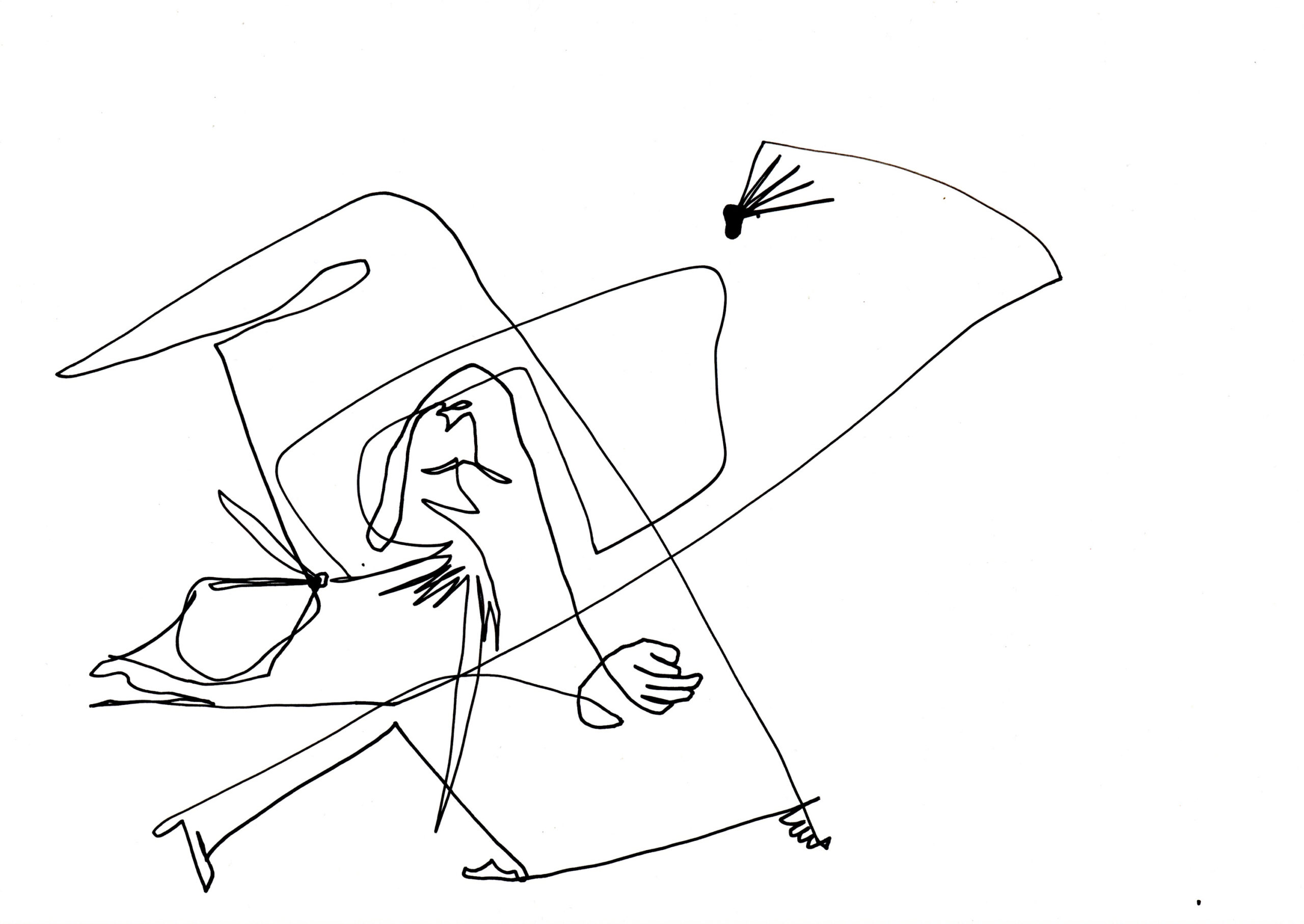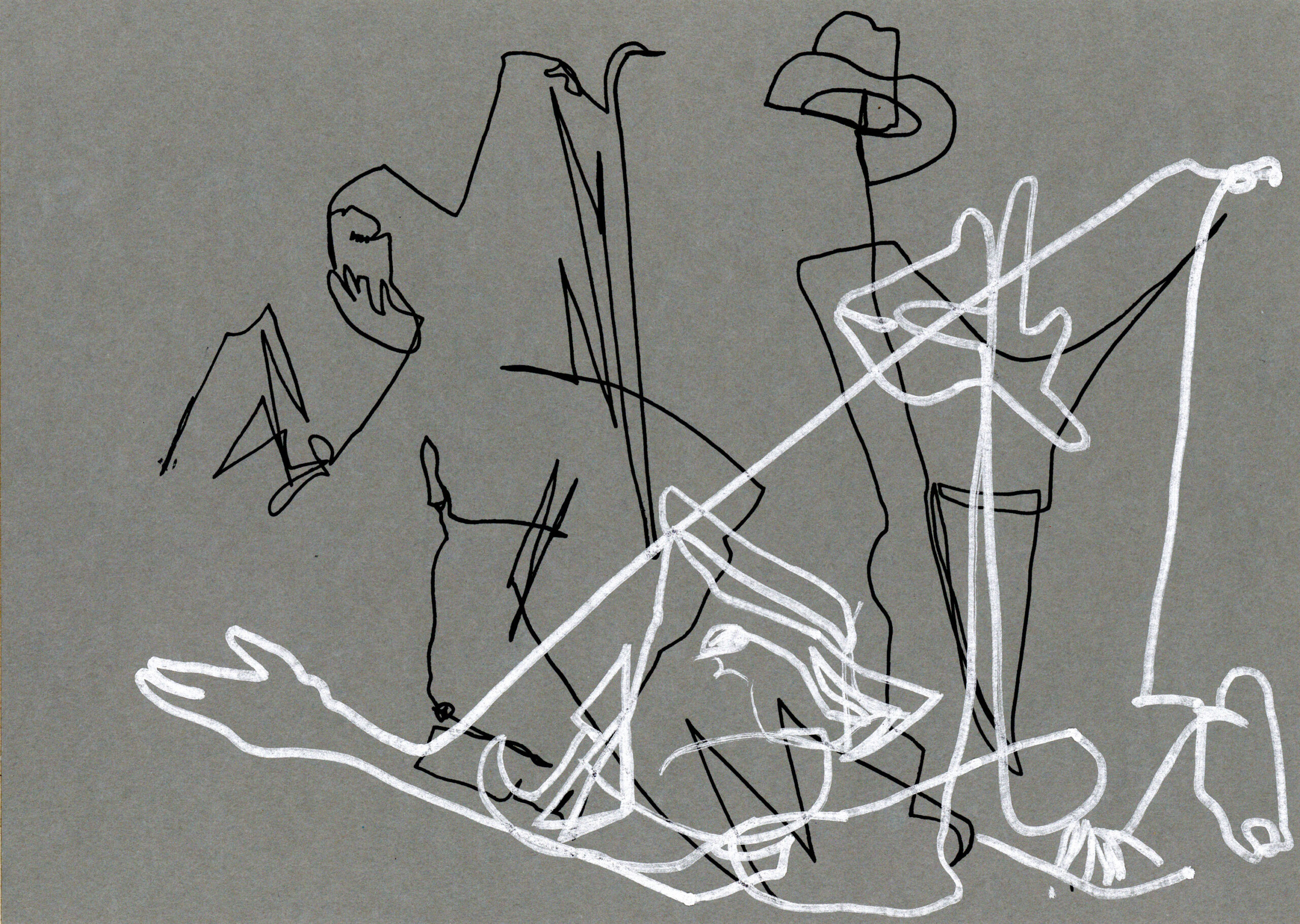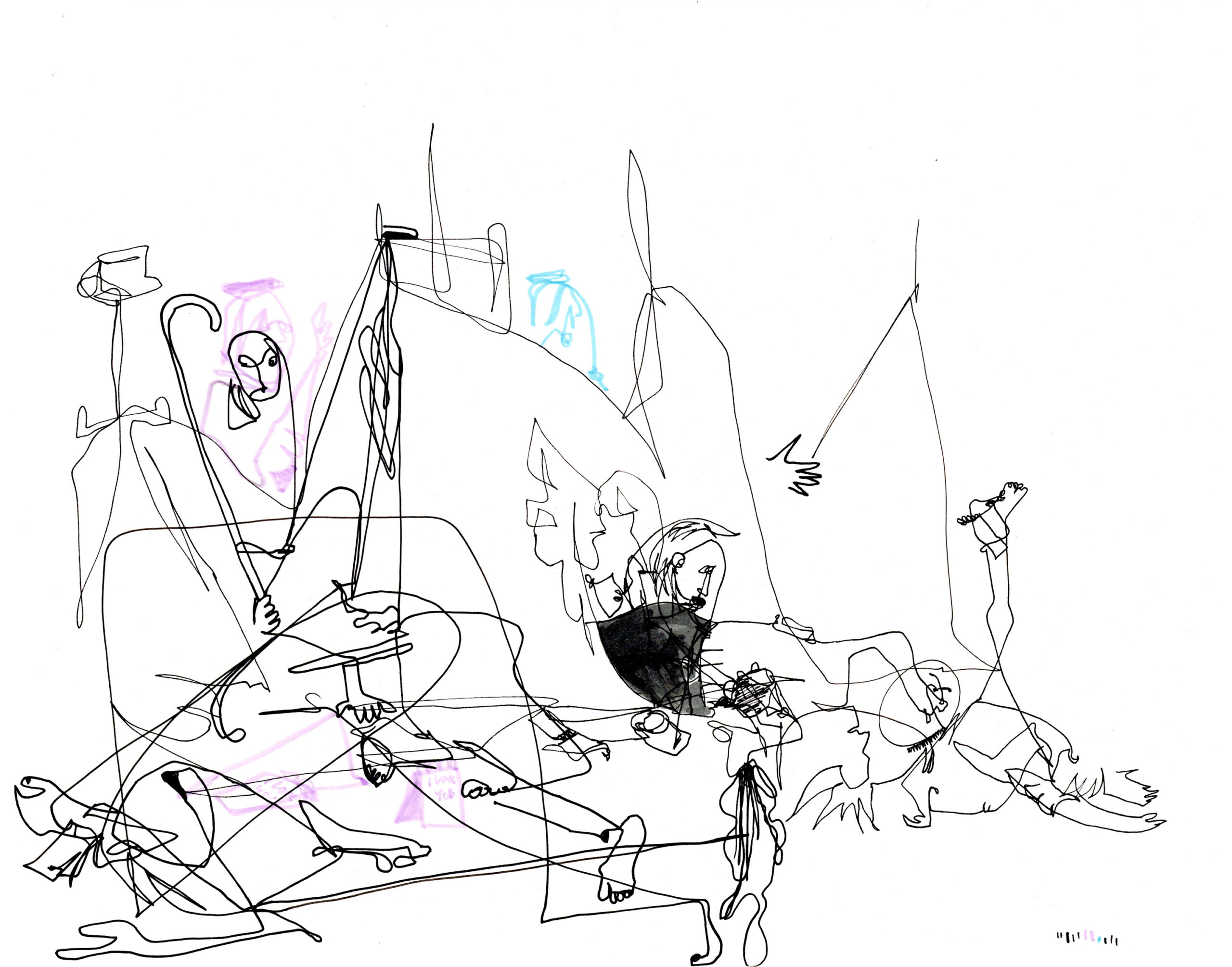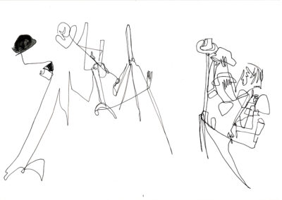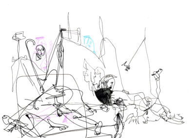 Line drawings with archival pens, pigment markers and chrome pens on various types of paper. As a gesture to the processes of archiving, each time I end one line and begin another I place a tally mark in the corner of the page. I see the one line drawing as filmic, like Super 8 – silent and with fresh cuts, one shot to the next, no transitions. I also see this process of drawing an event, like keeping memory – how fragmented and fractured it is.